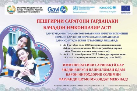 Тибқи қарори Ҳукумати Ҷумҳурии Тоҷикистон “Дар бораи гузаронидани чорабинии иммунизатсионии оммавӣ бар зидди вируси папилломаи одам дар Ҷумҳурии Тоҷикистон”, аз 1 октябри соли 2025 иммунизатсияи нақшавии духтарони 10-сола бо ваксинаи зидди вируси папилломаи одам ба таври доимӣ ба роҳ монда мешавад. Ҳамчунин аз 1 то 31 октябри соли 2025 чорабинии иммунизатсионии оммавӣ бар зидди вируси папилломаи одам дар Ҷумҳурии Тоҷикистон байни духтарони 11-14-сола гузаронида мешавад.