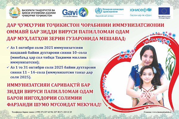 Ёдовар мешавем, ки маъракаи оммавии иммунизатсия бар зидди вируси папиломаи одам дар Ҷумҳурии Тоҷикистон аз 1 октябри соли ҷорӣ оғоз гардида, ин тадбир бо мақсади пешгирӣ ва коҳиш додани бемории саратони гарданаки бачадон ба роҳ монда шудааст.